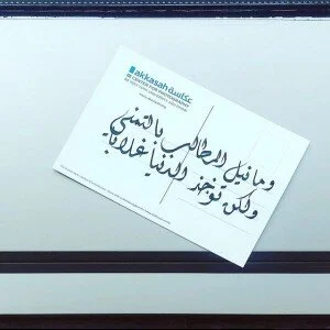 My interest in Arabic calligraphy stems from my deep interest in Arab culture, lifestyle, and heritage. More specifically, it developed from my passion for Arab music, the lyrics, and poetry verses of which always fascinated me. Arab songs usually contain Arabic poetry, used as lyrics. After a while, I noticed that I would find songs’ lyrics resounding in my head hours after listening to them. One day, I felt driven to write down some words that wouldn’t leave my mind. I wanted to write them in a decorative way, one that not only appealed to my aesthetic taste but that also best translated the meaning behind them.